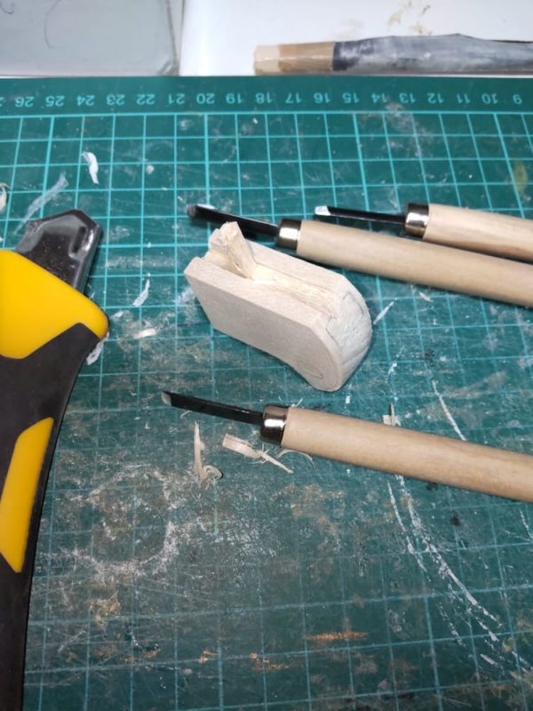 5mm厚の檜材を切り出して、彫刻刀で血流し用の溝を掘りました。独特の反りが特徴の鍔は、カッターナイフで加工しやすいバルサ材を重ねてある程度の形状に切り出してヤスリで調整しました。