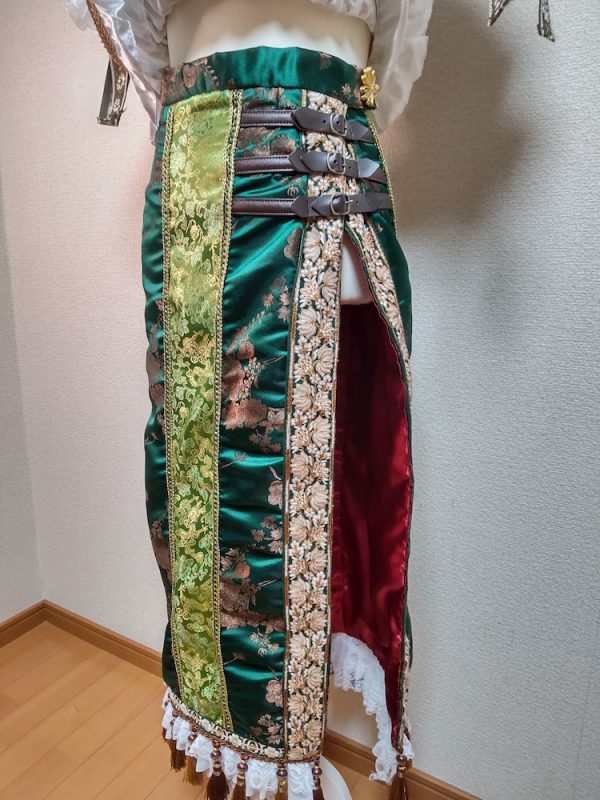 『龍』というコンセプトに合わせて龍柄のチャイナ生地を使って柄の切替をしており、裏地をサテンの赤にすることで紅美鈴のカラーイメージと同じ色合いになっております。